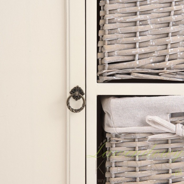 Szafka prowansalska w beżowym kolorze posiada szuflady, drzwiczki a także półki z koszami wiklinowymi. Urocze meble w stylu prowansalskim to między innymi ta szafka z koszami, ale także wiele innych. Zapraszamy!