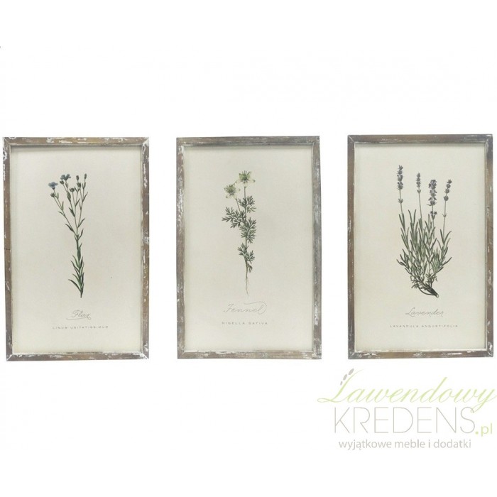 Obrazy Vintage to komplet trzech dekoracji ściennych od marki Chic Antique. Każdy z obrazków przedstawia inną roślinę na jasnym, lekko poszarzałym tle. Oprawione w brązowe, bielone ramki są dostosowane do wnętrz prowansalskich, francuskich oraz retro. Zauważalne zmiany niewielkim kosztem? To możliwe, tylko u nas!