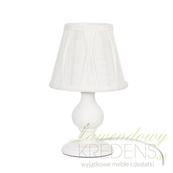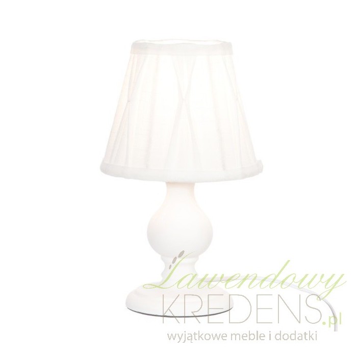Biała lampa prowansalska ma nogę zrobioną z drewna i materiałowy, marszczony abażur.