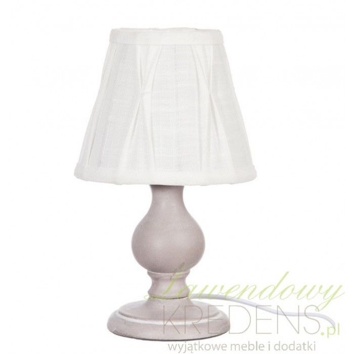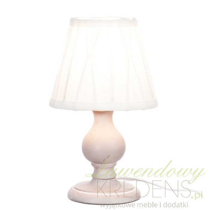 Lampa prowansalska ma rzeźbioną nogę z drewna i biały, materiałowy abażur. Noga lampy w porównaniu do jej całkowitej wysokości jest krótka, ma szarobrązowy kolor i jasne przetarcia. Razem z marszczonym abażurem ampa nocna wygląda zjawiskowo i pasuje na każdy stolik nocny. Lampki w stylu prowansalskim będą odpowiadały za relaksujący nastrój i optymalne, jasne światło każdego wieczoru.