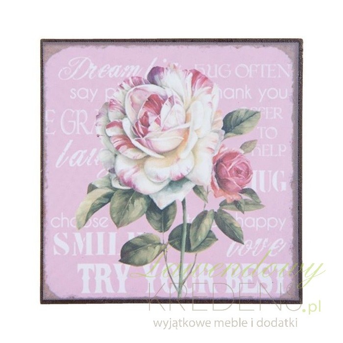 Magnes na lodówkę ma kwadratowy kształt i różowy kolor. Jest niezwykle kobiecy i nieco postarzany. Na jego środku znajduje się przepiękna biało-czerwona róża wraz z ozdobnymi napisami. Dodatki do kuchni i magnesy na lodówkę to świetny niewielki produkt, który potrafi w istotny sposób odmienić wnętrze kuchni.
