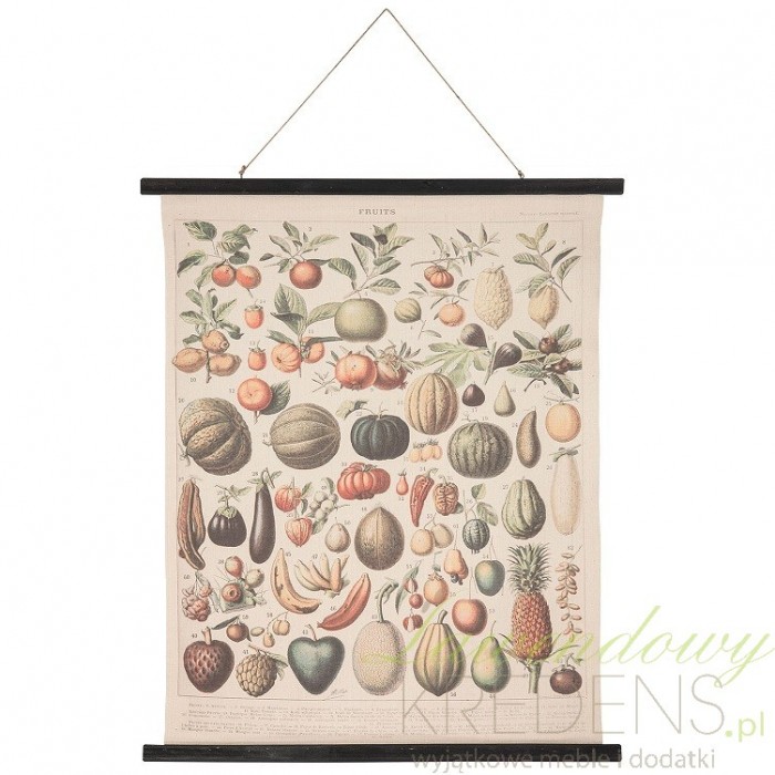 Obraz Vintage przedstawia kolorowe warzywa z wiosennego ogródka, gęsto rozmieszczone na poszarzałym tle. U dołu i u góry płótna zamontowano dwie, wąskie deseczki drewniane malowane na czarno. Do górnej deski doczepiono parciany sznurek, za pomocą którego zawiesisz obraz na ścianie. Obrazy do kuchni takie jak obraz z owocami sprawią, że wnętrze będzie wyglądało bardziej naturalnie.