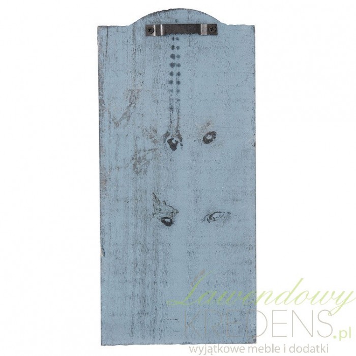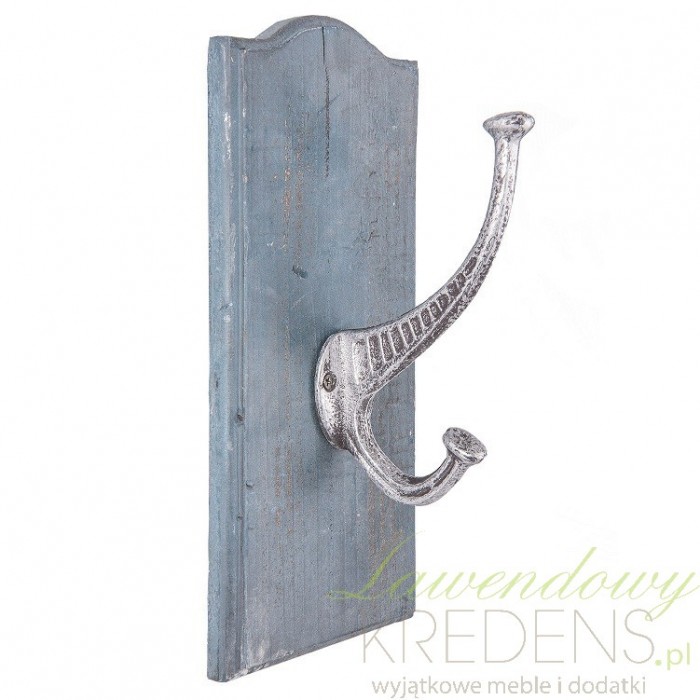 Wieszaki ścienne postarzane to zdobiące prkatyczne wnętrza dodatki do domu. Wieszak ścienny w kolorze niebieskim składa się z dwóch metalowych haczyków i drewnianej podkładki, którą z łątwością zamontujesz na ścianie. Bielenia metalu i przetarte delikatnie drewno uzupełnią każdy przedpokój lub kuchnie.