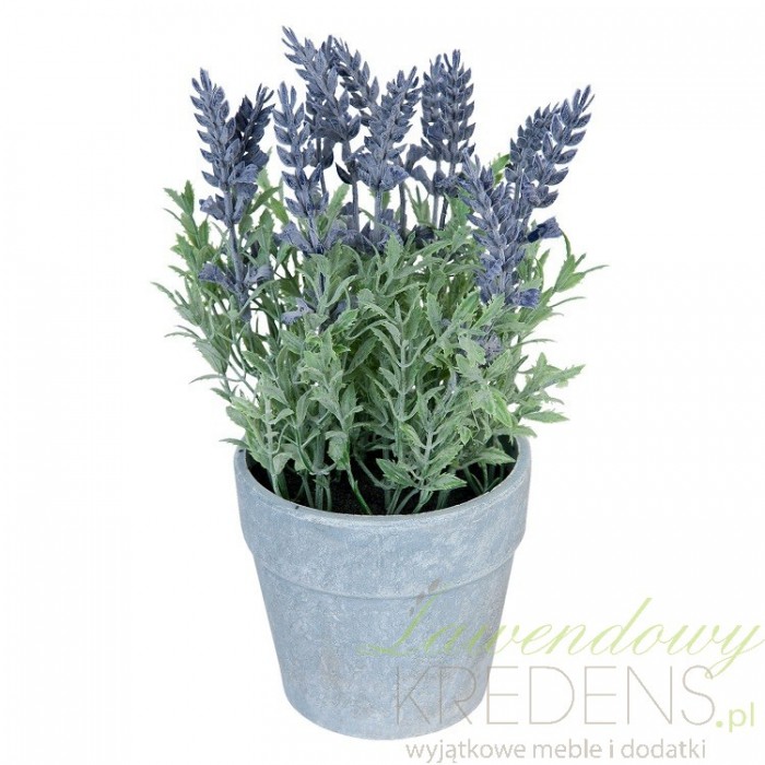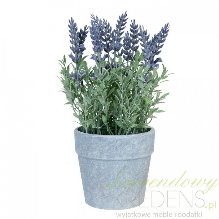 Sztuczna lawenda w szarej doniczce do złudzenia wygląda jak zadbany, żywy kwiat. Pięknie kwiatostany w fioletowym kolorze i zielone liście doskonale wyróżnią się na tle innych dekoracji. Sztuczne, lawendowe dekoracje to sprytne rozwiązanie jeżeli często podróżujesz i chciałbyś aby Twój dom wypełniały wiecznie kwitnące rośliny. Lawenda w donicy to urocze, sztuczne kwiaty w szarej donicy.