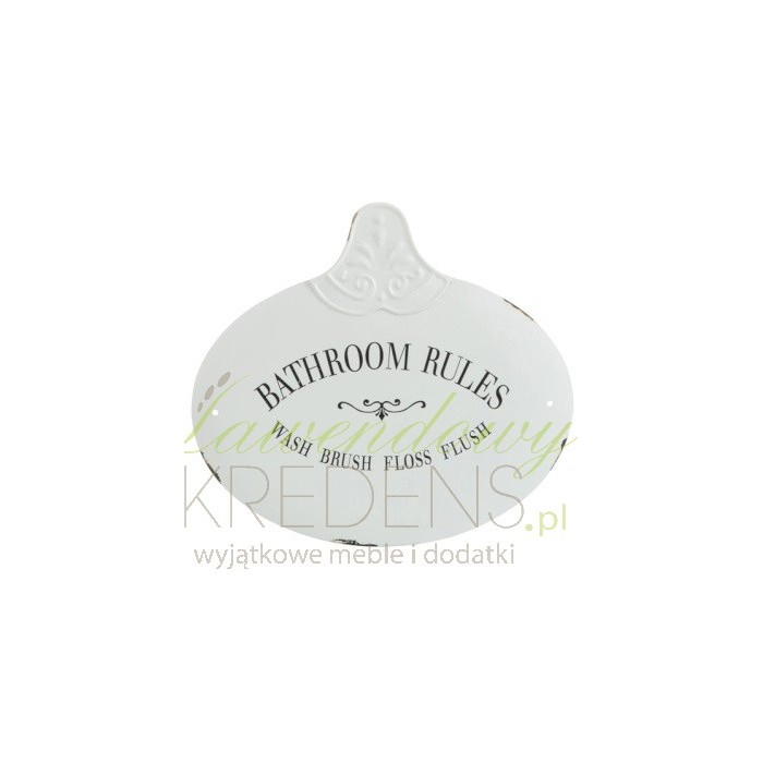 Tabliczka metalowa ma ciekawy kształt, który można umieścić w dowolnym widocznym miejscu. Wykonana jest z dobrej jakości metalu i ma biały, nieco przecierany kolor. Posiada czarne dekoracyjne i angielskie napisy, które tworzą zasady panujące w łazience. Dodatki do łazienki i metalowe tabliczki to ciekawy i interesujący pomysł na odmianę zwykłego i prostego wnętrza.