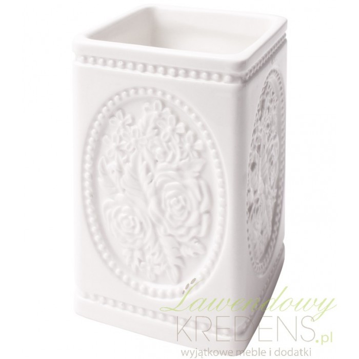 Kubek łazienkowy o kwadratowym kształcie. Biały, ceramiczny kubek na szczoteczki ozdobiony został pięknym motywem róż. Dodatki do łazienki to eleganckie i funkcjonalne przedmioty dla każego i na każdą kieszeń.
