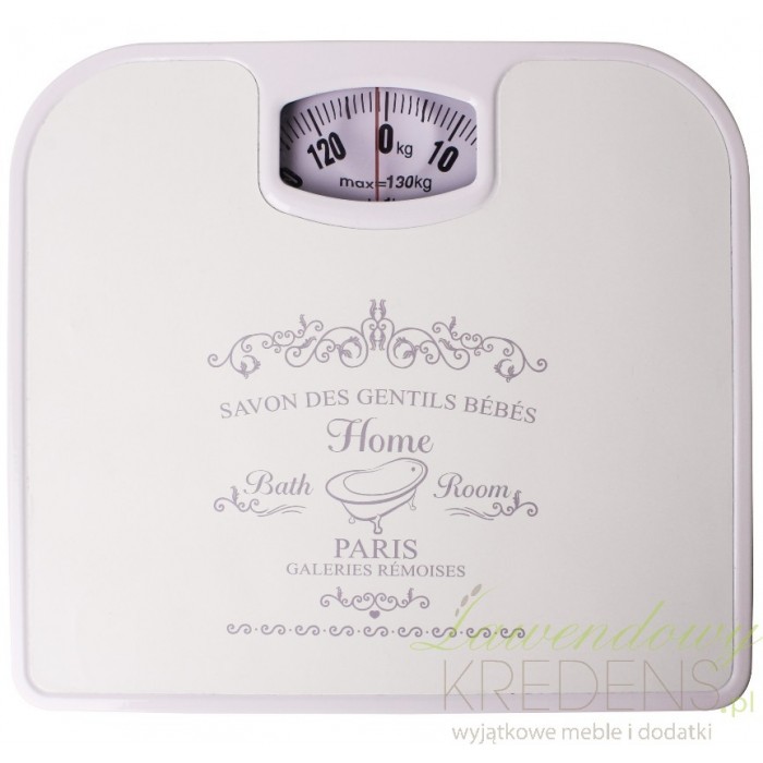 Waga łazienkowa w stylu prowansalskim z pewnością przyda się w każdej łazience. Wykonana z metalu i plastiku została ozdobiona eleganckimi i dekoracyjnymi napisami w języku francuskim. Waga do łazienki w stylu prowansalskim może stać swobodnie w wolnym miejscu w łazience ale też z łatwością możesz ją schować w łazienkowej komodzie. Takie dodatki dodatki do łazienki lubimy! Funkcjonalne w niepowtarzalnym wydaniu!