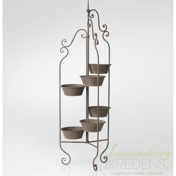 Piękny kwietnik stojący w stylu prowansalskim. Kwietnik z sześcioma osłonkami na donice to doskonały pomysł na niepowtarzalną aranżację Twojego ogrodu.
