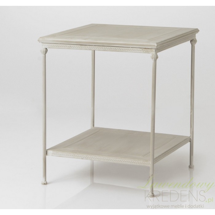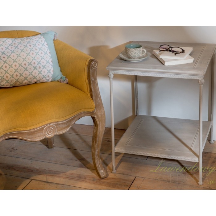 Stolik kawowy pochodzenia francuskiego ma śliczny szary kolor i kwadratowy kształt. Stolik nocny ma kwadratowy kształt i dodatkową półkę na dole, na której można postawić kubek z kawą czy położyć gazetę lub książkę. Stolik prowansalski wykonany jest z dobrej jakości metalu. Polecamy!