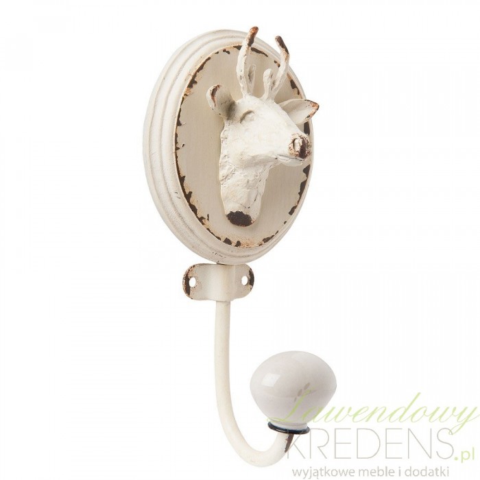 Wieszak ścienny zdobią nie tylko postarzenia ale także głowa jelenia wystająca z owalnej tabliczki.