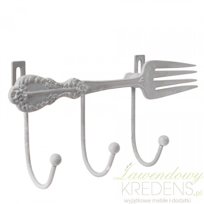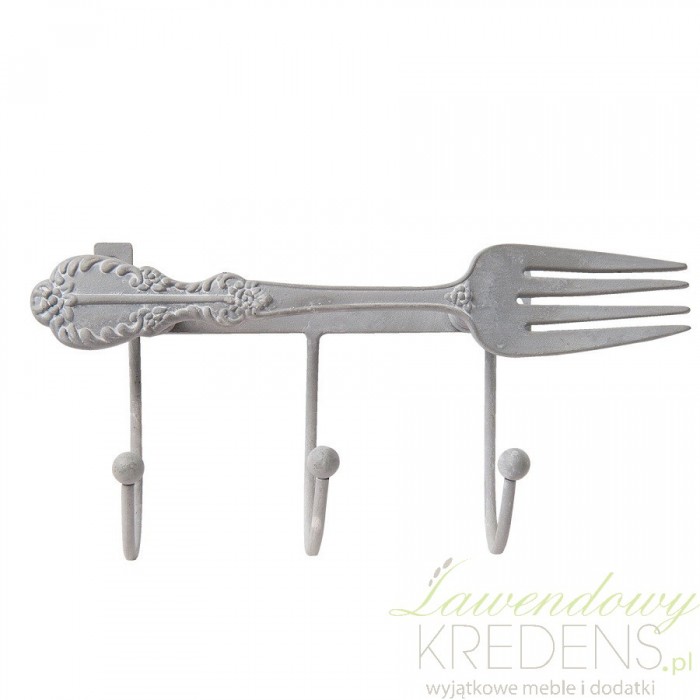 Jeżeli wieszaki ścienne do kuchni to tylko wieszaki z widelcem! Wieszak widelec jest cały jasnoszary i metalowy. Możesz go zamontować na ścianie dzięki dwóm otworom po bokach pomiędzy którymi znajduje się poziomo ułożony widelec ze zdobieniem. Wieszak kuchenny posiada trzy haczyki.