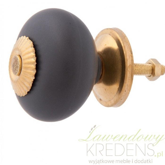 Gałka meblowa ma okrągły kształt i przepiękny ciepły grafitowy kolor. Posiada dodatkowe złote dekoracje, które w połączeniu z tym kolorem daje fenomenalny efekt. Gałki meblowe to fantastyczny pomysł na oryginalny i unikalny prezent.