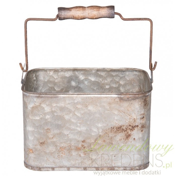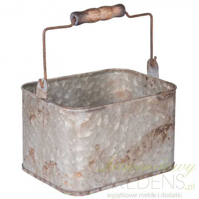 Metalowy pojemnik firmy Clayre & Eef ma prostokątny kształt i szary kolor. Jest mocno postarzany i ma dużą rączkę zakończoną drewienkiem. Pojemnik posłuży jako skrzynka na narzędzia czy też potrzebne przedmioty do ogrodu.