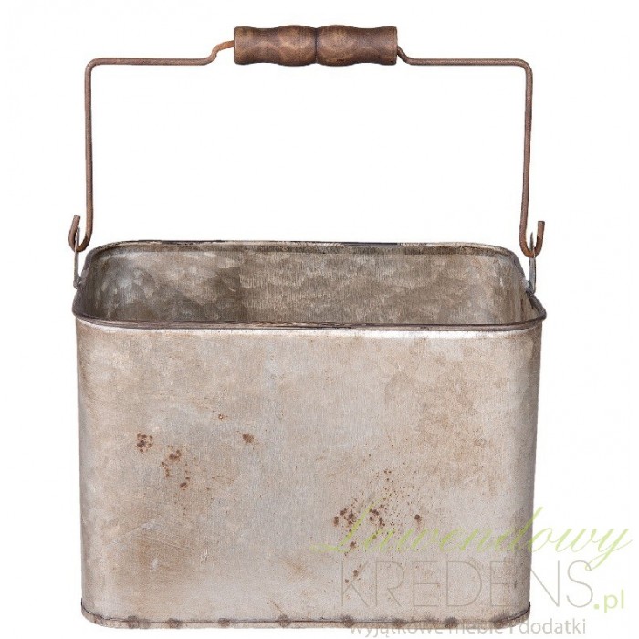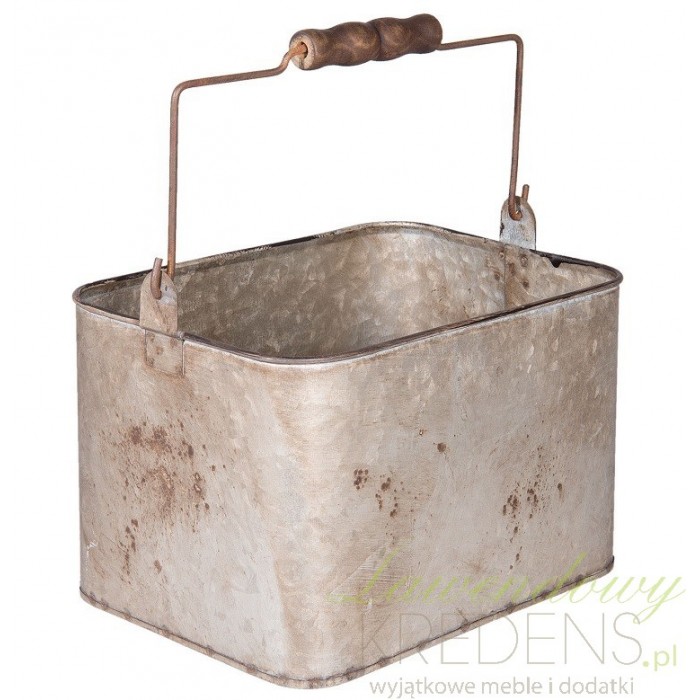 Metalowy pojemnik firmy Clayre & Eef ma prostokątny kształt i szary kolor. To co go wyróżnia to duża rączka zakończona drewnianymi chwytami. Pojemnik jest postarzany co nadaje mu wdzięku. Idealny na biżuterię, albo też drobne roślinki czy kwiatki.