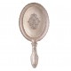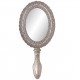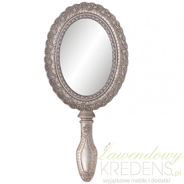 Eleganckie lusterko ręczne wykonane z metalu w srebrnym kolorze urozmaicono regularnym rzeźbieniem wokół tafli lustra oraz na rączce.