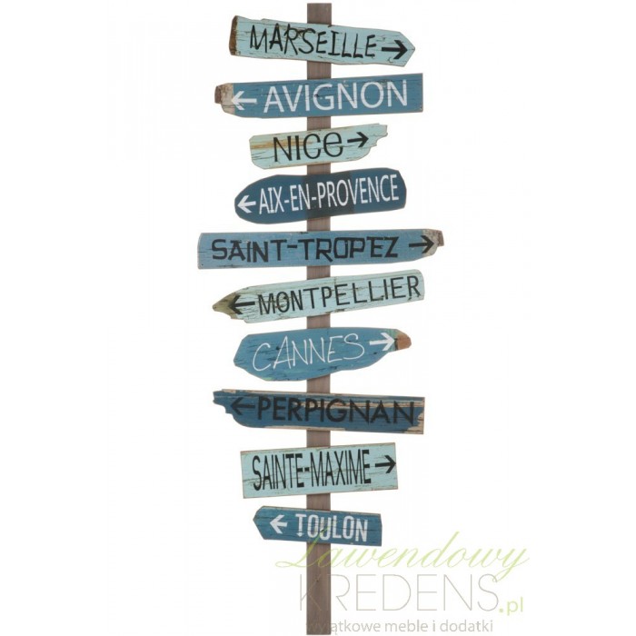 Dekoracja ścienna, która wygląda jak drogowskaz to prostokątne tabliczki przymocowane do drewnianej deski. Tabliczki pomalowano na różne odcienie niebieskiego i napisano na nich czarnymi literami nazwy miast francuskich. Każda z tabliczek jest postarzona, wygląda jak ułamana lub wyciągnięta z rzeki. Dodatki w stylu retro polecamy wielbicieliom staroci.