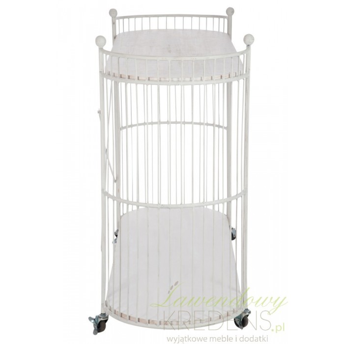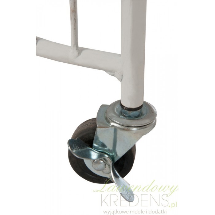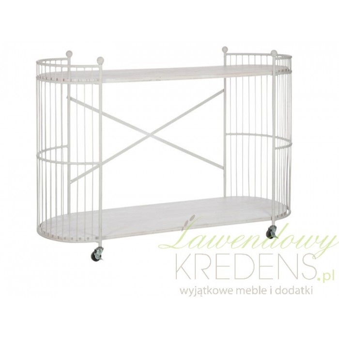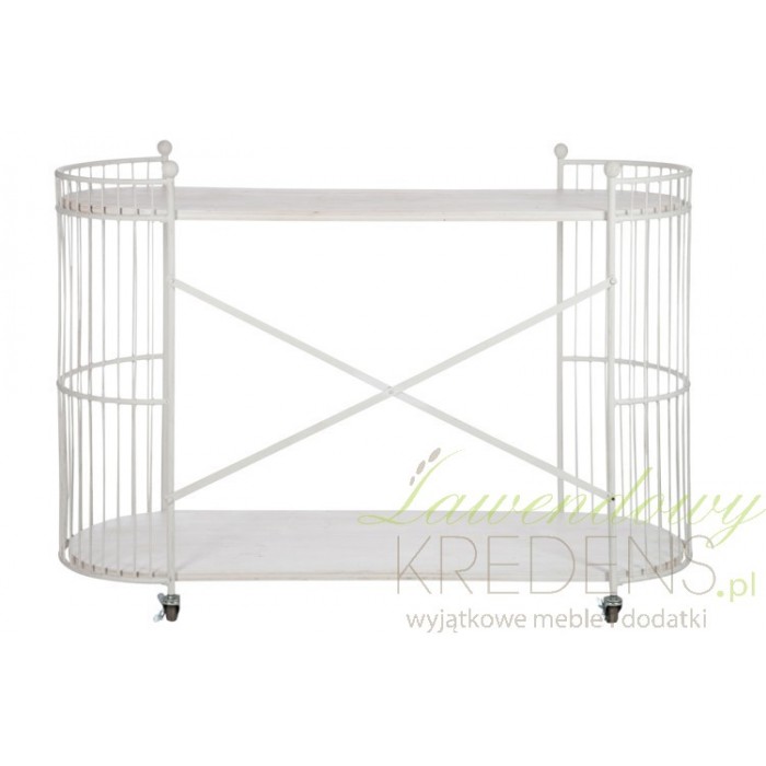 Biała konosola wykonana została z metalowych i drewnianych elementów. Konsola jest podłużna i ma zaokrąglone boki okryte metalową kratką. Posiada dwie drewniane półki w kształcie owali, które pomalowano białą, matową farbą. Metalowa konsola na kółkach to mebel, którego główne cechy to praktyczność i solidność.