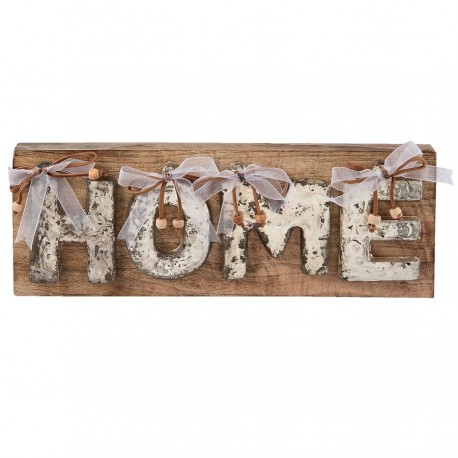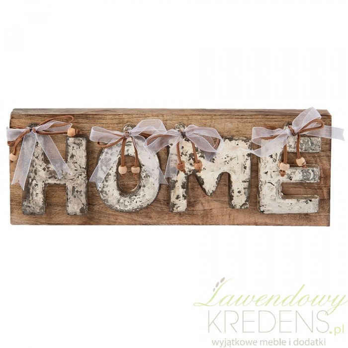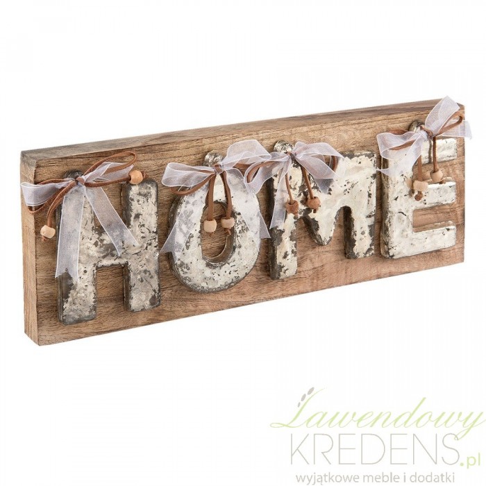 Napis Home na desce wykonano z czterech mocno postarzonych liter, które nawiązują wyglądem do bardzo starych dekoracji.