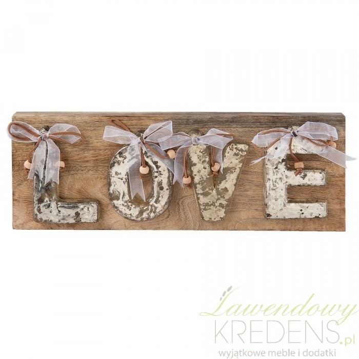 Dekoracja ścienna wykonana z drewna posiadająca postarzany napis love, a nad nim ozdobne kokardki. Clayre & Eef, to marka, która ma wiele produktów przykuwających wzrok swoim nietuzinkowym wykonaniem.