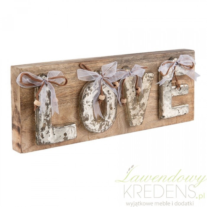 Drewniana tabliczka mająca napis love, zaprezentuje się w wyjątkowy sposób na ścianie pomieszczenia pełnego miłości.