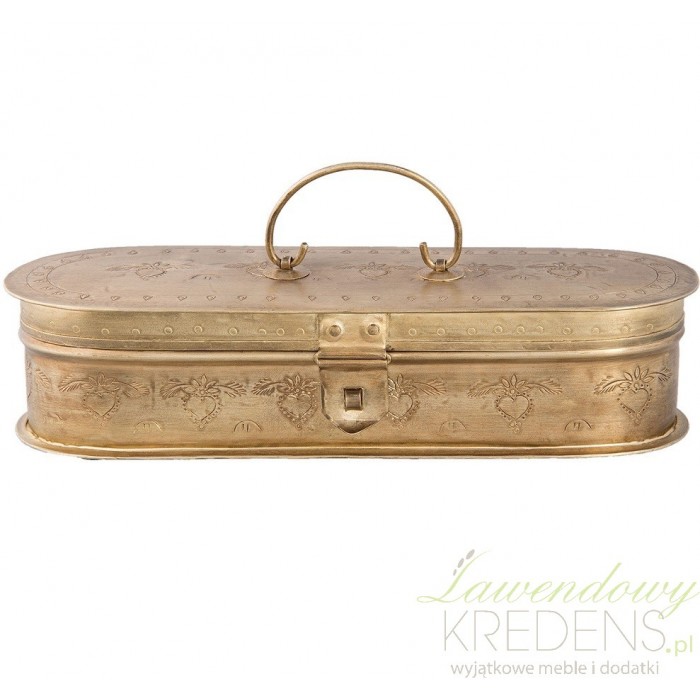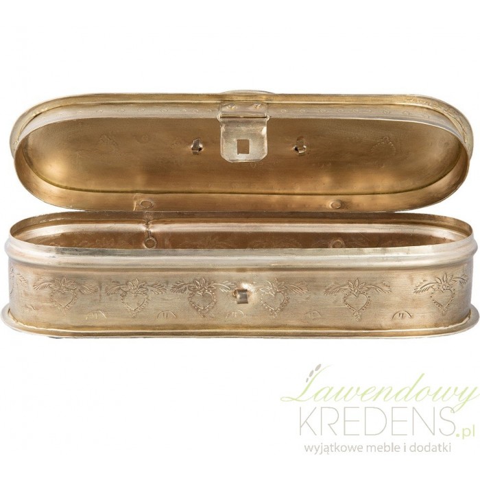 Pojemnik na długopisy wykonany jest z metalu i ma złoty postarzany kolor. Złoty pojemnik firmy Clayre & Eef ma owalny kształt i przepiękne zdobienia w postaci rzeźbień. Doskonale posłży na długopisy czy inne wartościowe rzeczy.