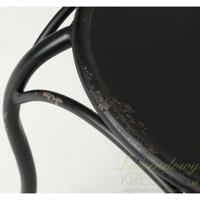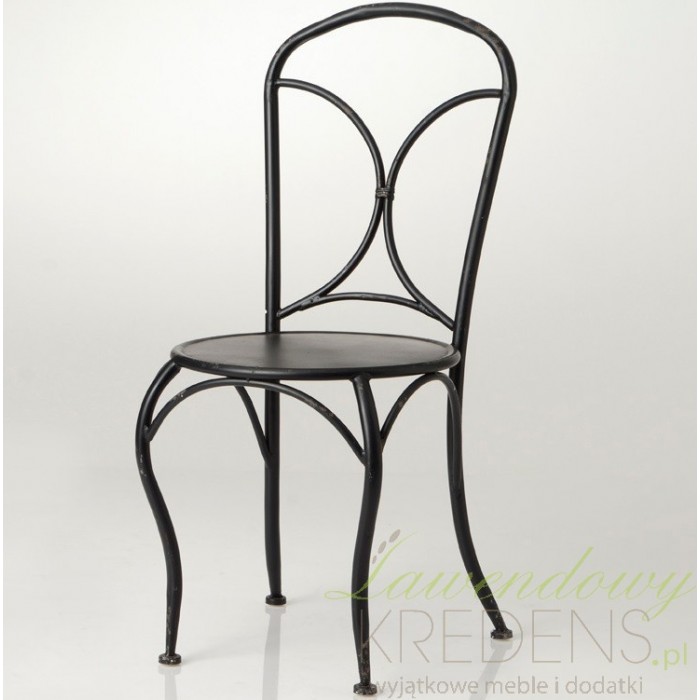 Krzesło metalowe prowansalskie wykonane w czarnym kolorze z prostym oparciem i gustownie wykonanymi postarzeniami jest przeznaczone do wykorzystania na zewnątrz lub w mieszkaniu.