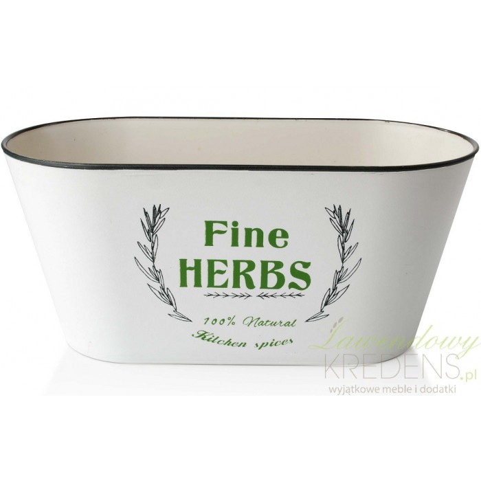 Biała osłonka na zioła została zrobiona z plastiku, a dzięki odpowiednim zabiegom takim jak zaznaczona na czarno krawędź wygląda jak metalowa. Na białej osłonce znajdują się zielone napisy Fine Herbs i dwie szare gałązki oregano. Osłonka w stylu francuskim będzie wyglądała pięknie zarówno na kuchennym blacie jak i na parapecie. Moda na zieleń i styl francuski w kuchni nigdy nie przemininie, dlatego zamów ozdobne osłonki na doniczki już teraz i posadź w nich rośliny by rozkwitły na wiosnę!