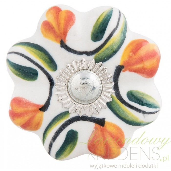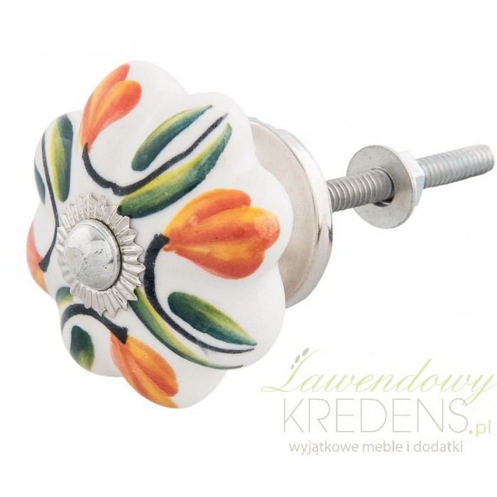Ceramiczna gałka meblowa Clayre & Eef w białym kolorze ozdobiona pomatańczowo - zielonym wzorem i posiadająca kształt kwiatu, który uroczo wejdzie w nowe otoczenie. Gałki meblowe, które zaskakują w naszej ofercie każdego. Zapraszamy!