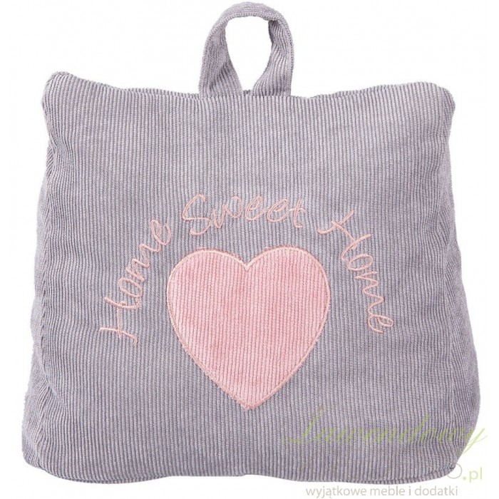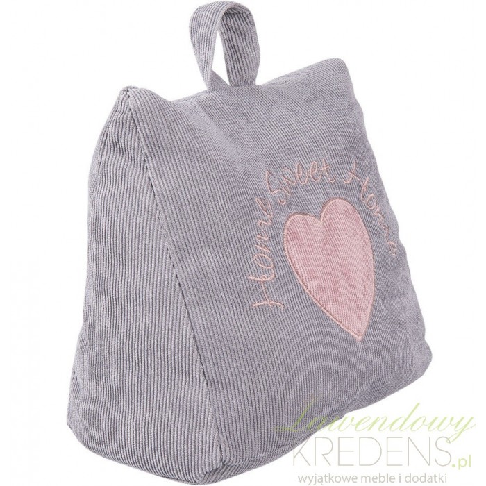 Stoper do drzwi w szarym kolorze, którego kształt przypomina uroczą torebeczkę. Ozdobny ogranicznik do drzwi posiada różowe serduszko oraz napis Home Sweet Home. Clayre & Eef posiada bogatą ofertę przeróżnych dodatków do wnętrza.