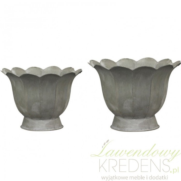 Osłonki na doniczki Chic Antique mają kapitalny kształt niczym tulipany. Wykonano je z metalu, nadano im grafitową barwę i postarzono. Metalowe osłonki różnią się od siebie kształtem i mają obie ciekawą krawędź, zaznaczoną falowaną linią. By wypełni wykorzystać walory osłonek - połącz je w zgrany duet z zielonymi bądź kolorowymi roślinami.
