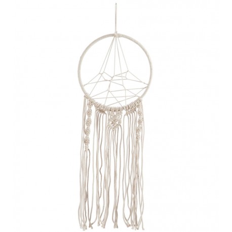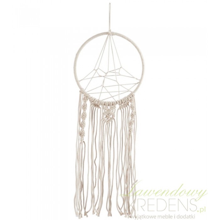 Podstawowym elementem, z którego został wykonany łapacz snów jest otwarty okrąg. Wewnątrz okręgu wpleciona została sieć naprężonych sznureczków. U dołu dekoracji swobodnie zwisają zaplecione warkocze i materiałowe sznurki. Wybieraj artykuły dekoracyjne w stylu boho w najlepszym wydaniu!