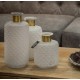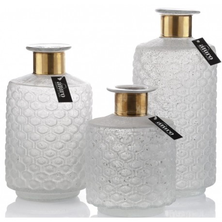 Wazon Auro ma wyjątkowy kształt z wypukłościami i wykonany jest ze szkła o mlecznej fakturze. To piękne naczynie sprawdzi się w każdym wnętrzu jako miesjce na kwiaty i nie tylko. Równie dobrze będzie wyglądał jako wolnostojąca ozdoba półki. To co wyróżnia wazonik Belldeco to złote zdobienie na górnym, wąskim rancie.