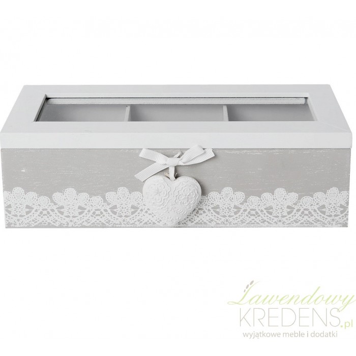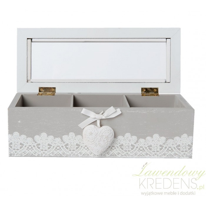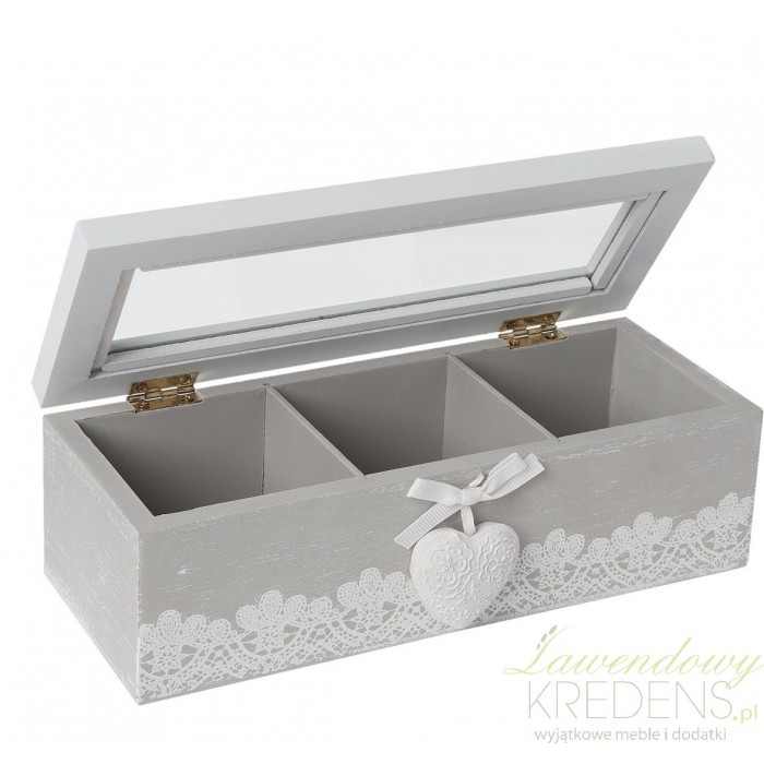 Pudełko na herbatę w stylu prowansalskim to ozdobione sercem i koronką pudełeczko z przykrywką do przechowywania torebek z herbatą.