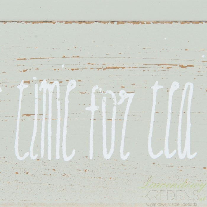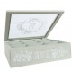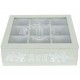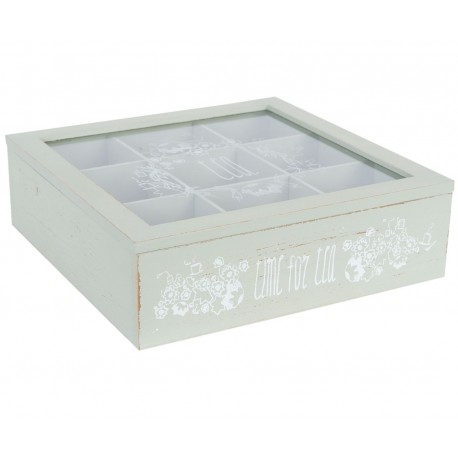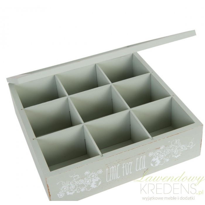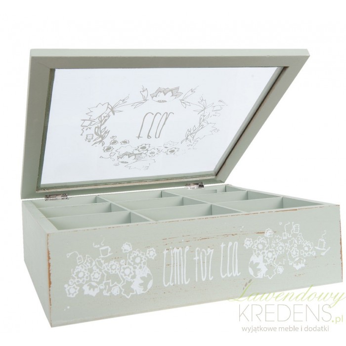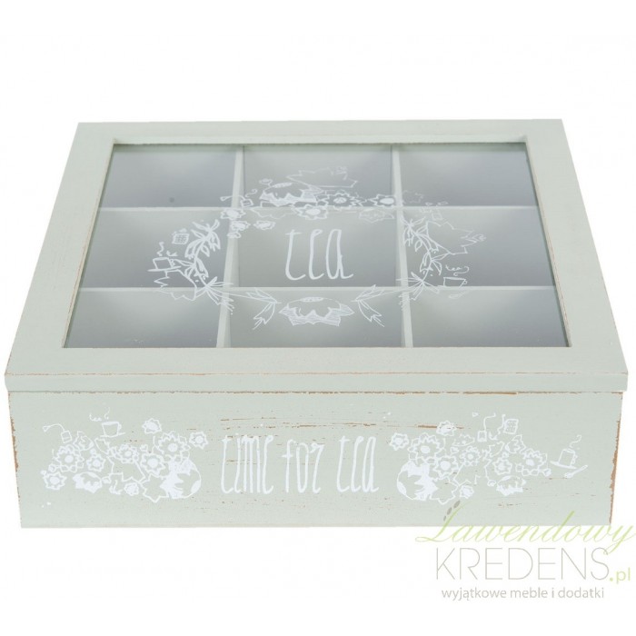Pudełko na herbatę w stylu prowansalskim zostało wykonane z drewna i szkła, dzięki któremu widoczna jest zawartość przegródek wewnątrz pudełka.