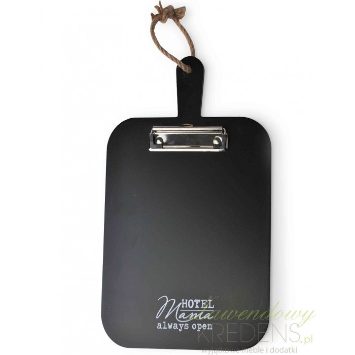 Czarna tablica do pisania kredą została wykonana w kształcie deski do pisania. Deska posiada brązowy sznurek do zawieszenia na ścianie i srebrny klips do przypięcia kartek z przepisami. U dołu czarnej tablicy znajdują się ozdobne napisy angielskie. Dzięki ozdobnej tablicy będziesz mógł szybko zapisać nowy przepis na udany obiad, który wpadnie Ci do głowy podczas gotowania. Dodatki do kuchni - wiemy czego potrzebujesz!