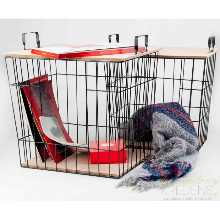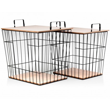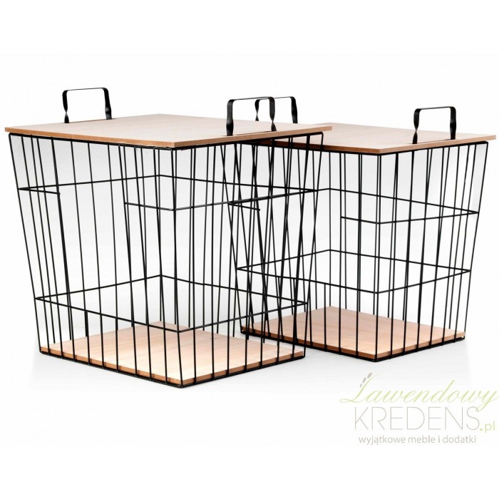 Metalowe kosze wykonane zostały z czarnego metalu i brązowego drewna. Do blatów zamocowano po dwa poręczne uchwyty ułatwiające podnoszenie przykrywki. Dzięki ażurowej formie będziesz mógł łatwo i szybko odnaleźć to czego szukasz. Wybieraj stoliki kawowe, które dają nieograniczone możliwości użytkowania i dopasowują się do Twoich aktualnych potrzeb.