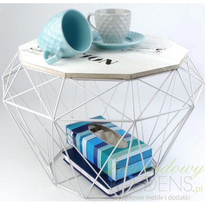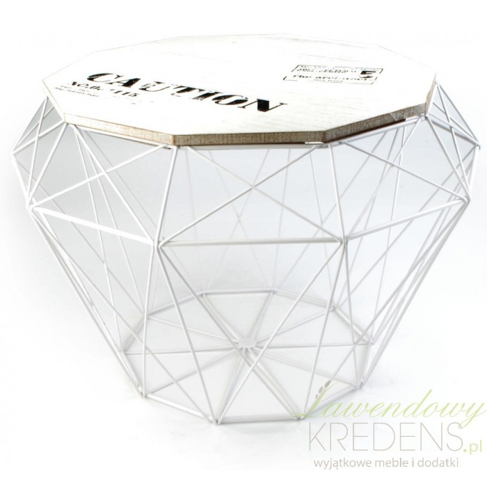 Metalowy kosz o finezyjnym kształcie to nietuzinkowe podkreślenie stylu industrialnego, może on stanąć w domu jako stolik kawowy ponieważ posiada drewniany blat ozdobiony napisami. Ciekawa dekoracja, przy której miło spędzimy czas.
