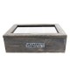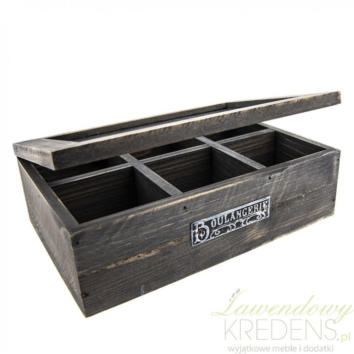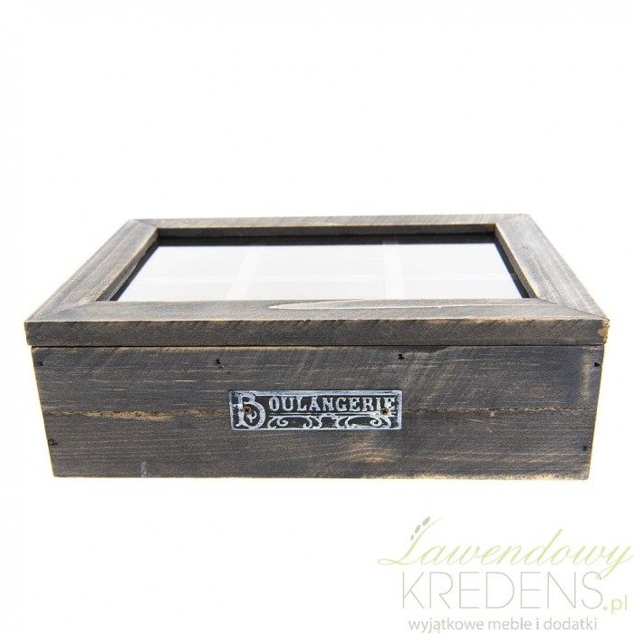 Pudełko na herbatę w stylu prowansalskim wykonano z drewna o grafitowym wybarwieniu i wyposażono je w przeźroczystą przykrywkę ze szkła.