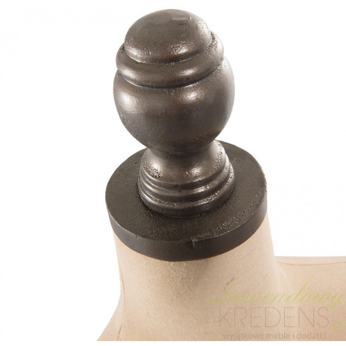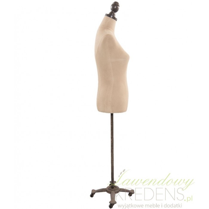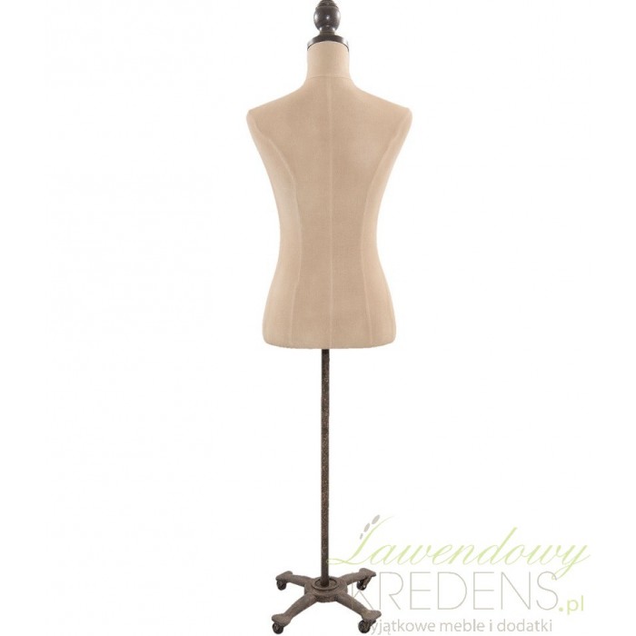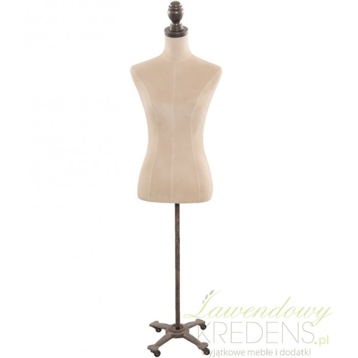 Manekin ozdobny wykonany jest z materiału i metalu. Manekin dekoracyjny ma jasny kolor i stoi na ciemnej nodze. Dodatki prowansalskie w formie profesjonalnych manekinów to doskonały wybór.