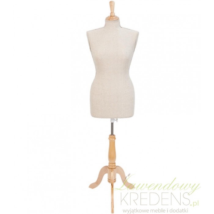 Manekin dekoracyjny wykonany jest z materiału i metalu i stoi na drewnianej nodze. Manekin ozdobny ma beżowy kolor, dzięki któremu każda bluzka czy sukienka będzie świetnie wyglądać. Dodatki prowansalskie takie jak manekiny doskonale nadają się dla projektantów ubrań czy do sklepów z odzieżą.