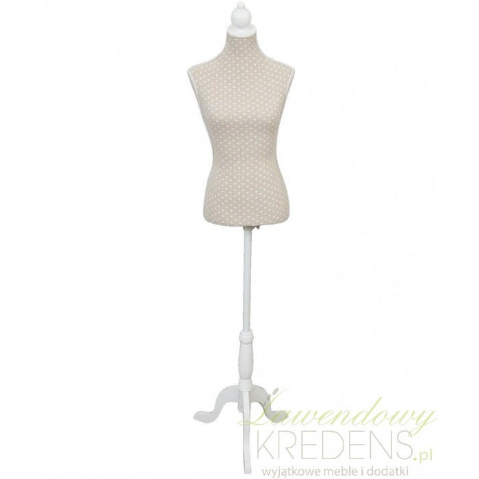 Dodatki prowansalskie, a wśród nich manekin dekoracyjny wykonany jest z dobrej jakości materiału i drewna. Ma beżowy kolor a na jego tle małe ozdobne białe serduszka. Manekin ozdobny stoi na białej nodze i ma regulowaną wysokość.