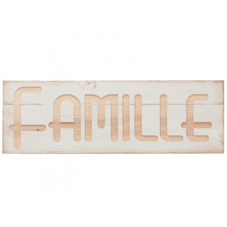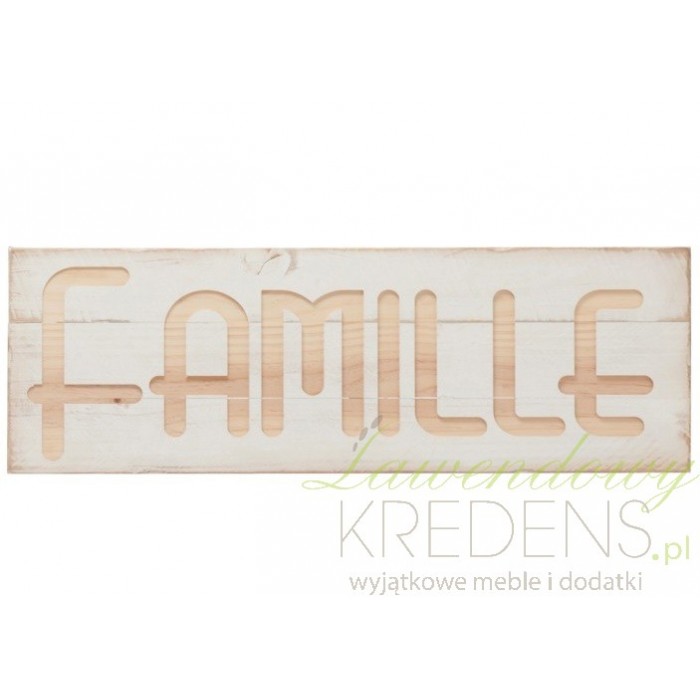 Duża, drewniana tablica, której szerokość sięga ponad 90cm będzie wyrazistą i rozpoznawczą dla twojego domu ozdobą. Tablica ozdobna ma kształt prostokąta i jasny kolor. Litery są wycięte w tablicy i mają z kolei kolor brązowy. Litery układają się w napis Famille. Takie dodatki do domu świetnie podkreślają przyjazne wnętrza i rodzinny klimat w nich panujący.