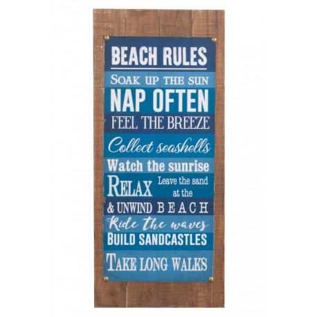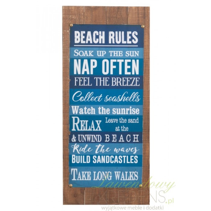 Tablica marynistyczna Beach Rules doskonale odnajdzie się w każdej radosnej aranżacji, gdzie nie ma mowy o nudzie.