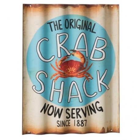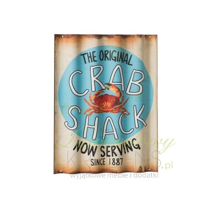 Tablica z krabem wykonana została w całości z metalu i ma falowany kształt. Wyróżniające go postarzenia zachodzą na każdą z jego krawędzi. Tło obrazka to czerwony krab i angielskie napisy. Dekoracje marynistyczne takie jak dekoracje z krabem to ozdoby idealna do wnętrza gdzie dobre jedzenia to podstawa.