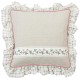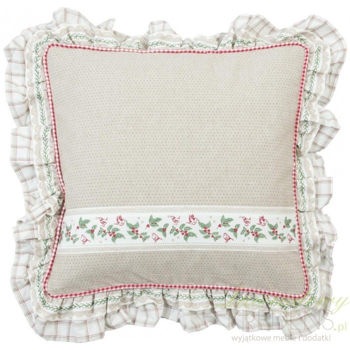 Kwadratowa poszewka prowansalska na poduszkę ma krawędź długości 40cm. Poduszka w pastelowych kolorach ozdobiona jest kraciastą falbanką i czerwonym obszyciem. Na przodzie poduszki, na beżowym materiale naszyto ozdobny pasek z ostrokrzewem. Prowansalskie dekoracje takie jak oszewki w stylu prowansalskim świetnie sprawdzą się we wnętrzu francuskim, skandynawskim oraz prowansalskim.