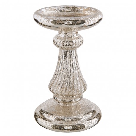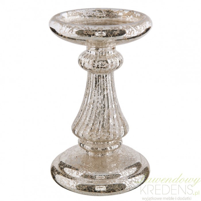 Srebrny świecznik ma niesamowity wygląd i jest postarzany. Postarzany świecznik firmy Clayre & Eef nie jest zbyt wysoki i stoi na okrągłej podstawce. Doskonale będzie wyglądał na komodzie czy stole.