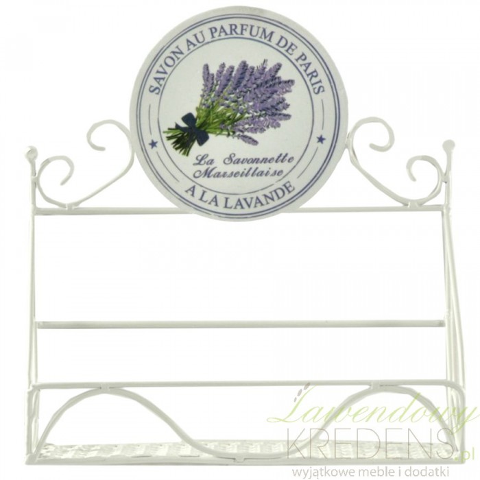 Półka ścienna wykonana z metalu w białym kolorze. Półka z lawendą u góry to wyjątkowe miejsce do postawienia na przykład szamponów czy też żelu pod prysznic. Dodatki w stylu prowansalskim zabłysną swoim wykonaniem i ozdobnymi motywami.