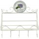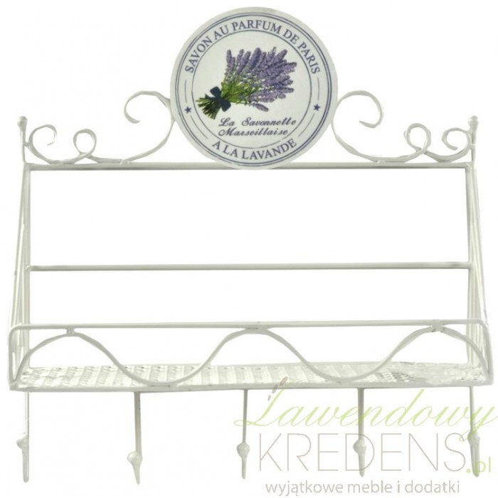 Półka z lawendą jest wykonana w całości z metalu i pomalowana na biało. Na samej górze półki do krawędzi metalowej ramy zamocowano ozdobne kolo z grafiką lawendy wśród napisów. Półka ścienna posiada także pięć praktycznych haczyków i ażurowy spód. Dodatki w stylu prowansalskim wzniosą twoja kuchnie na wyższy poziom funkcjonalności.