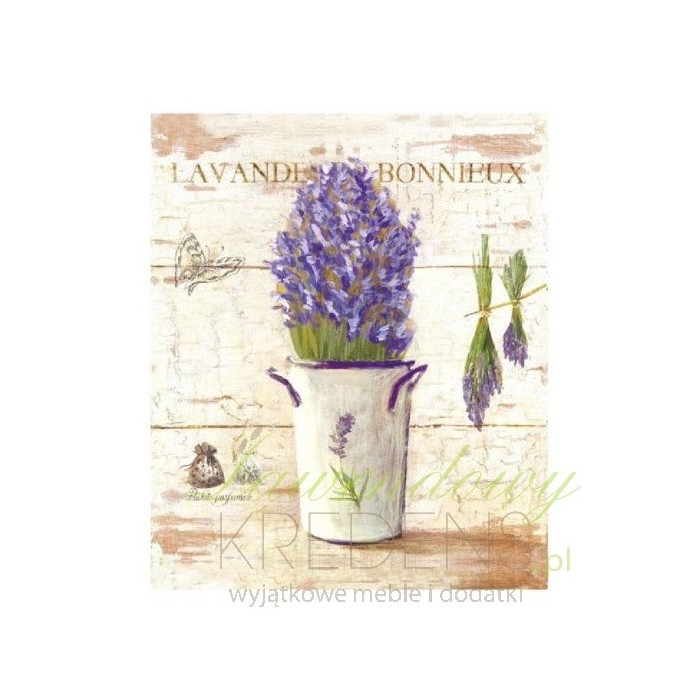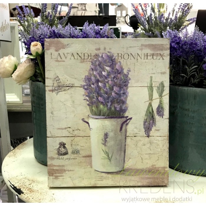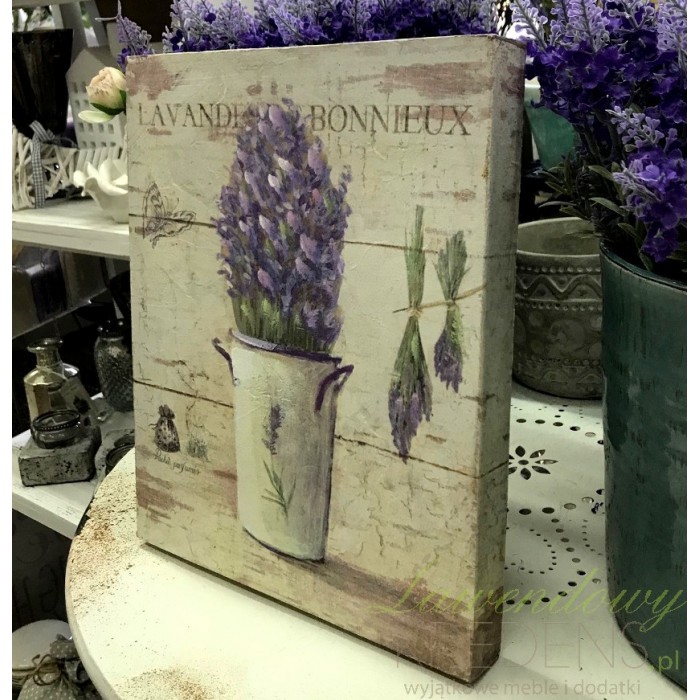 Prostokątny obrazek z lawendą wyglada jak ogrodowa aranżacja i przedstawia świeżą lawendę w białym wiaderku oraz motyla. Obraz malowany na drewnie jest postarzony, co jeszcze bardziej wzmacnia styl prowansalski. Jasne tło kremowe doskonale komponuje się z fioletowymi kwiatami. Lawendowe dekoracje takie jak obrazki z lawendą doskonale pasują do kuchni.