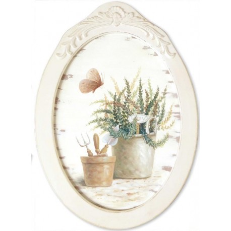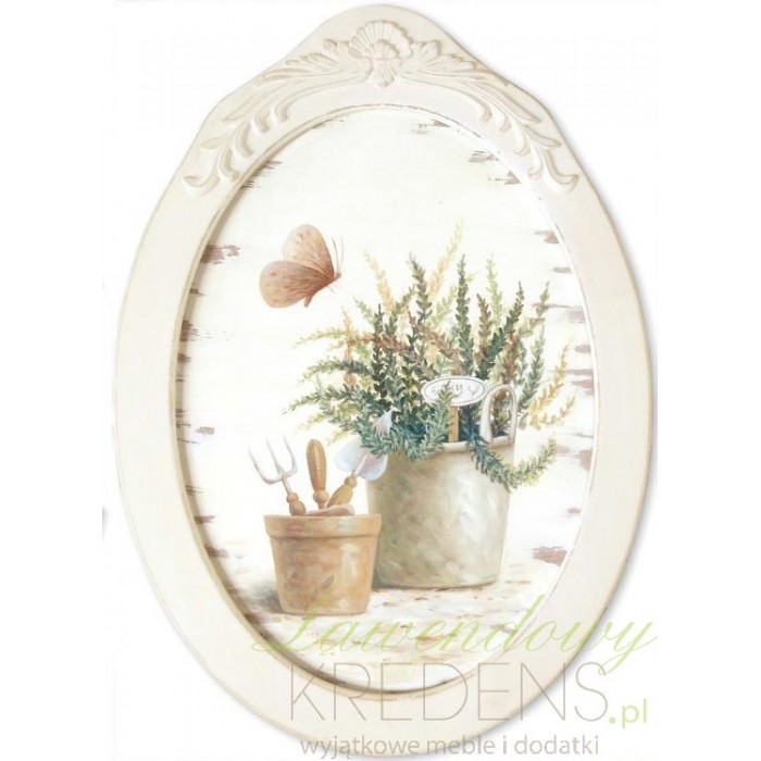 Obraz prowansalski ma grubą białą dekoracyjną ramę z pięknym rzeźbieniem. Wykonany jest z wysokiej jakości drewna i ma owalny kształt. Obrazy w stylu prowansalskim przedstawiają cudowne roślinki i doniczki w iście prowansalskim stylu. Styl prowansalski to bogactwo wzorów i wspaniałych rzeźbień.